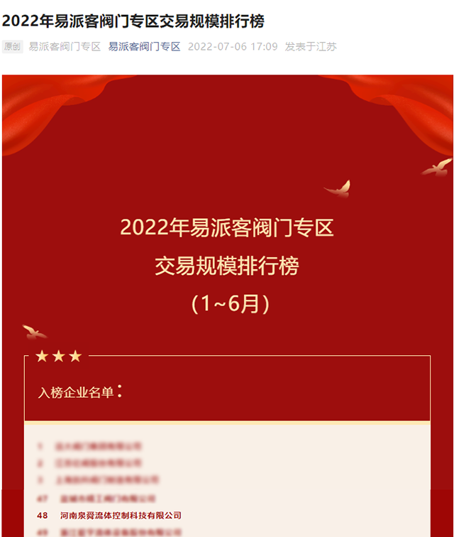 7月6日,易派客阀门专区官方发布《2022年易派客阀门专区交易规模排行榜》,royal皇家88平台流控榜上有名。作为河南省阀门行业唯一进入该排行榜的企业,royal皇家88平台流控一直致力于切实解决客户痛点,满足客户需求,以赋能客户为己任,不断升级产品和技术创新,服务于石油化工行业、电力行业、钢铁行业、供热行业、冶金行业与煤化工等行业。 royal皇家88平台流控作为多家央企集团框架供应商,与中国石油化工行业深度合作,更是连续多年拿下中石化巴陵石油化工有限公司、中国石油化工股份有限公司物资装备部、中国石油化工股份有限公司茂名分公司、中国石油化工股份有限公司齐鲁分公司、万华化学集团物资有限公司等企业双向金属硬密封旋球阀框架订单,凭借优质的产品和全心的服务获得行业盛赞和信赖。 未来,royal皇家88平台流控将继续深耕市场,深化合作,以“发展、整合、专业、向上”的发展理念,为用户提供更优质的产品和服务,与广大战略合作伙伴共创共赢。